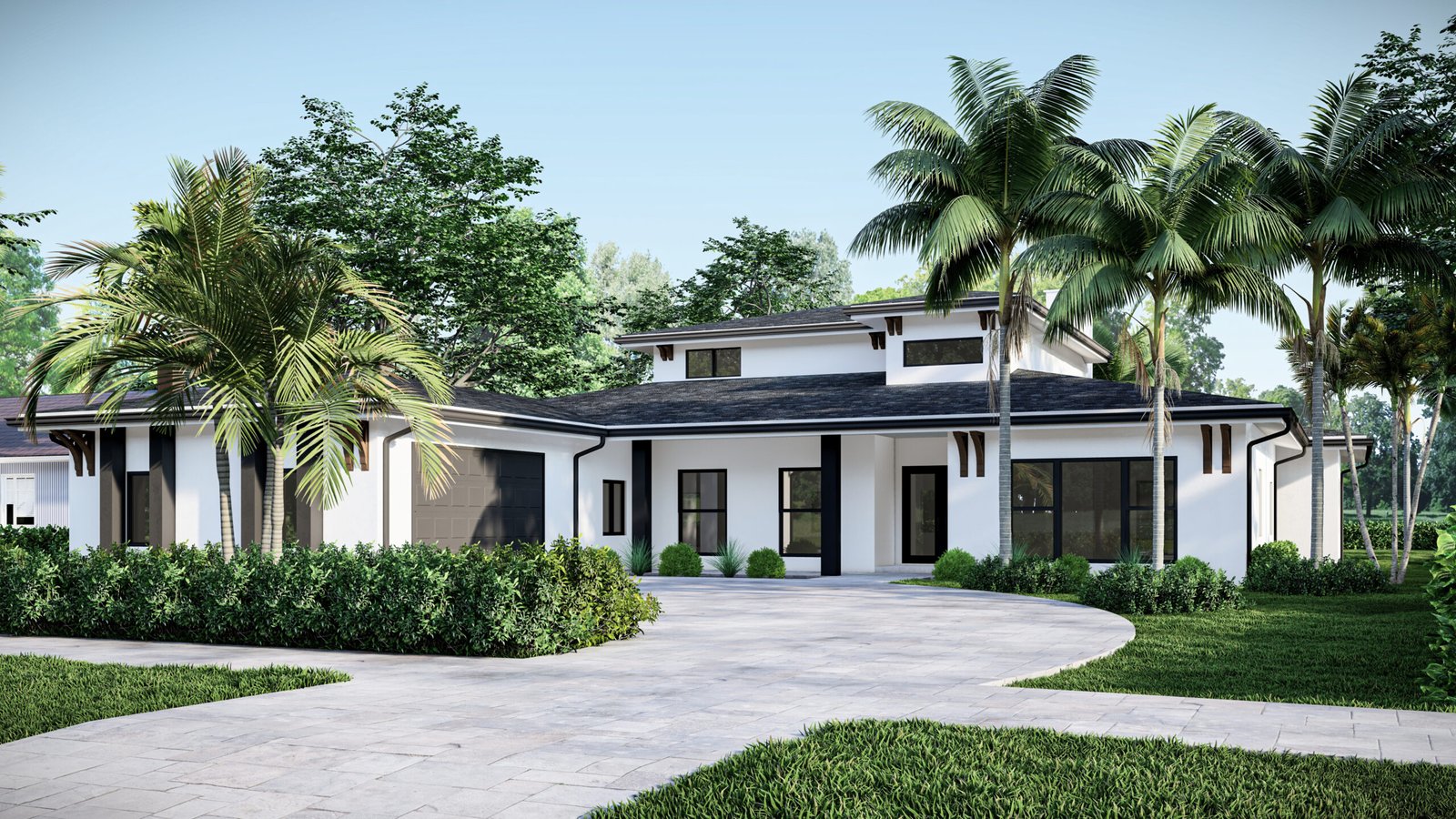 The landscaped surroundings, complete with palm trees and lush hedges, reinforce the home’s connection to nature, while a wide, paved driveway enhances accessibility and curb appeal.