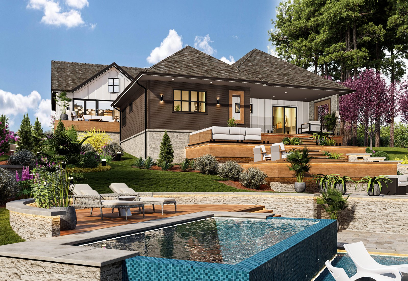 Multi-Level Outdoor Spaces: Thoughtfully designed terraces with lounge seating and dining areas.