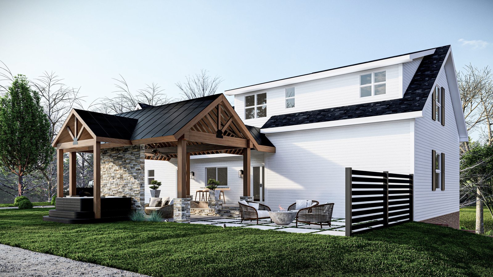 A beautifully designed modern farmhouse that seamlessly blends traditional and contemporary elements. The house features a clean white façade with black window shutters and a contrasting dark roof, creating a timeless yet sophisticated aesthetic. The outdoor space is designed for relaxation and social gatherings, with a covered patio featuring wooden beams, stone accents, and a cozy seating area.