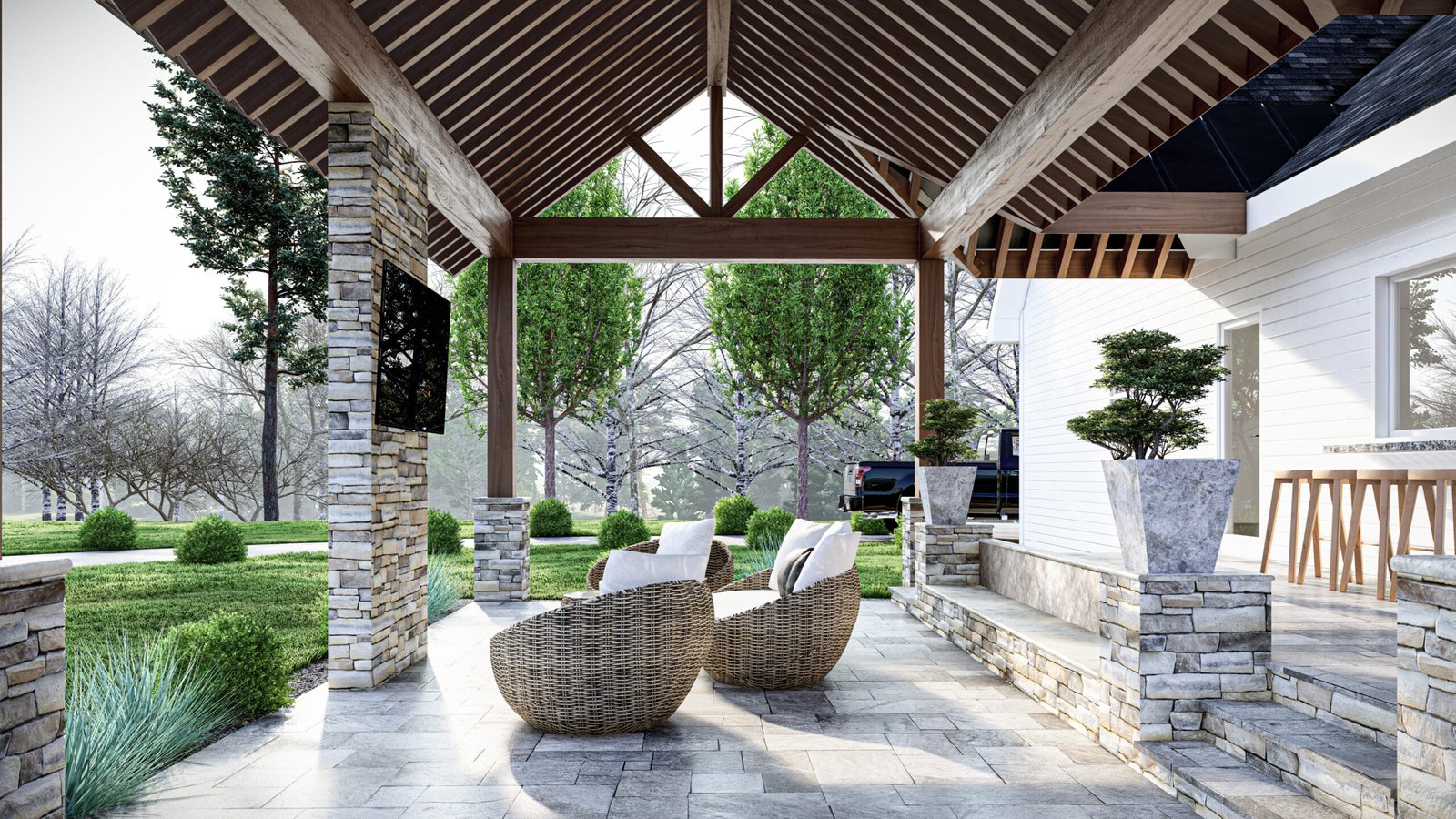 Outdoor Living Space: A covered patio with exposed wooden beams, stone columns, and a built-in seating area